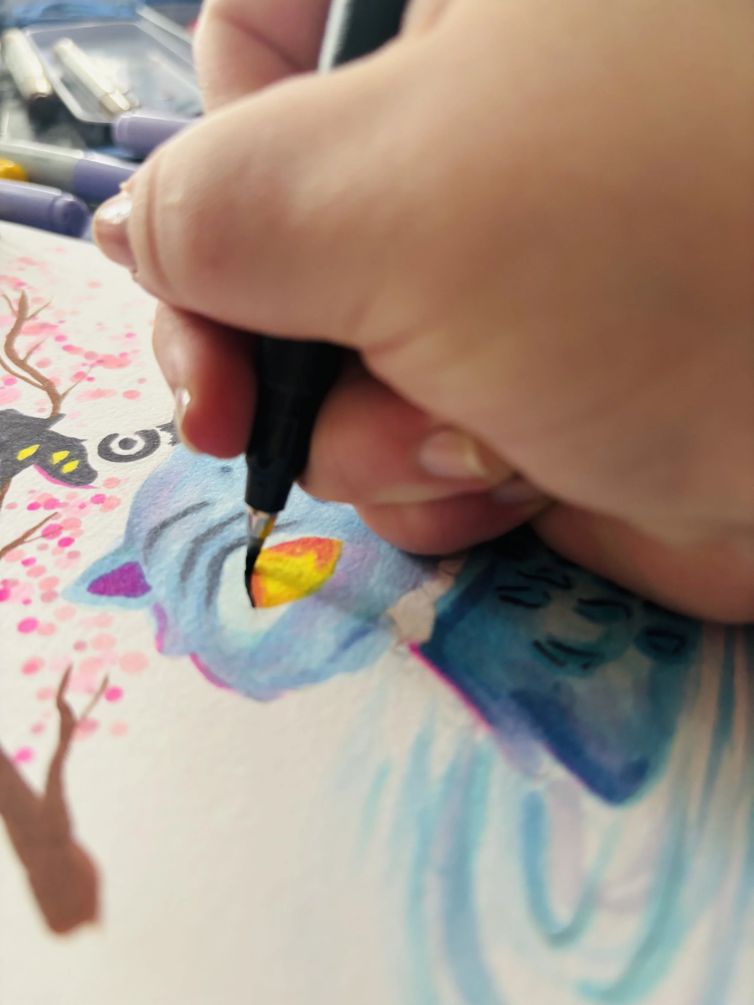Hi, I am Elizabeth. I am a young artist who creates whimsical animal artwork. My two cats, Eclipse and Misty, inspire me every day. I have dyslexia, my own mental health issues, and I am a carer to members of my family. This allows me to be understanding of others as well as visually creative, escaping into my art. I love Disney and Studio Ghibli, which have inspired me throughout my art journey. I care deeply about animals, so I strive to be environmentally friendly in every way possible. I hope you will join me in my art and business journey.